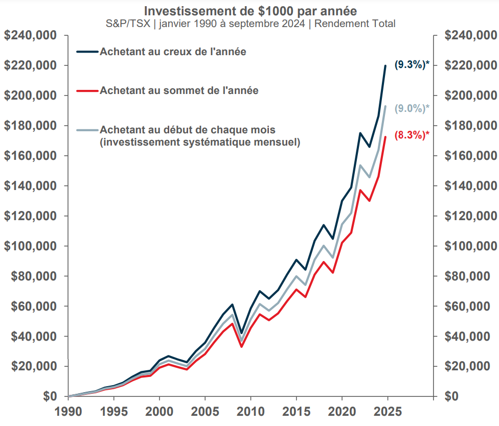 Les statistiques démontrent qu’essayer de déjouer le marché n’est pas la meilleure stratégie d’investissement; elle risque de se solder par la dépréciation du capital. Il est recommandé d’épargner à long terme, en procédant à des réajustements sporadiques. En investissant tôt, les placements auront plus de chances de croître et offrent plus de temps pour se remettre des pertes qu’on pourrait éventuellement subir.